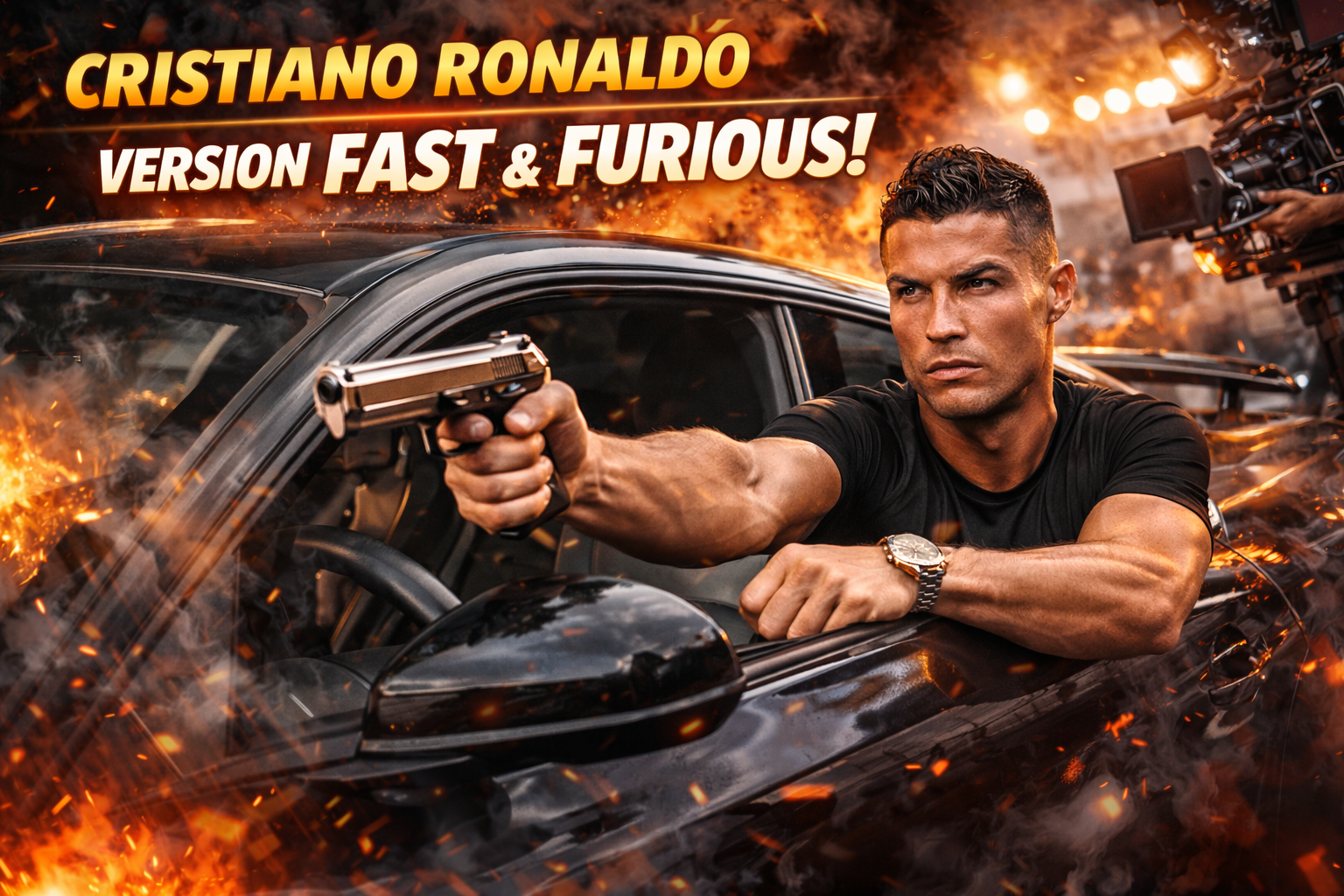 Sur cette image spectaculaire, la star du football apparaît plongée dans un décor totalement cinématographique : flammes, chaos maîtrisé, tension maximale. Le style rappelle immédiatement l’univers Fast & Furious, avec son mélange de vitesse, d’adrénaline et de héros charismatiques.